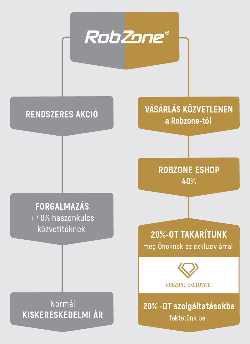Gyakran kérdezik tőlünk, hogy hogyan lehetséges, hogy robotjainkat nem találják meg a különféle elektronikai áruházakban vagy láncokban. Úgy döntöttünk, hogy nem szabványos megoldásokat választunk, de úgy gondoljuk, hogy jó úton haladunk a kizárólagos saját disztribúcióval a www.robzone.hu oldalon keresztül. Ez lehetővé teszi számunkra, hogy kedvező exkluzív árat vagy rendkívüli promóciós árat kínáljunk Önnek, mivel nem kell haszonkulcsot fizetnünk a forgalmazóknak, amely akár 40%-ot is elérhet. Örömmel megosztjuk Önnel a viszonteladóknak fizetett megtakarításainkat. Így Ön 20%-kal alacsonyabb Exclusive árat kap, mi pedig a fennmaradó 20%-ot robotok fejlesztésére és szolgáltatások javítására fordíthatjuk.