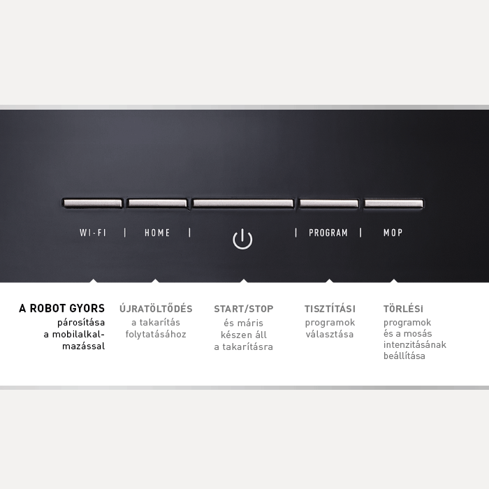 A robot ezen modelljének megtervezésekor arra gondoltunk, hogy a működését igazán egyszerűvé és praktikussá tegyük, így a legfontosabb funkciók és beállítások közvetlenül a kijelzőn megtalálhatók és mindig kéznél lesznek.